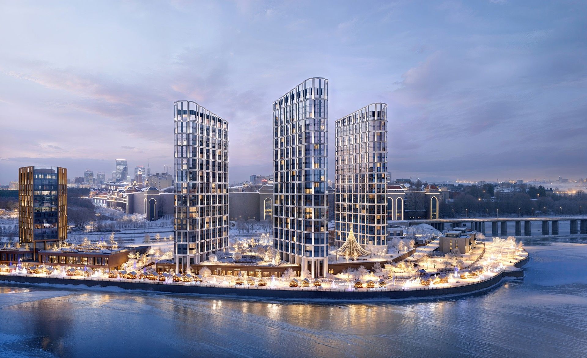 Благоустройство квартала включает 3 гектара приватного двор-парка, благоустроенную набережную с гастропроменадом и три клубных лобби: гостиную с камином, детское игровое кафе и кафе-бар. Для резидентов доступны Спа-центр, фитнес и сервис на уровне отелей.